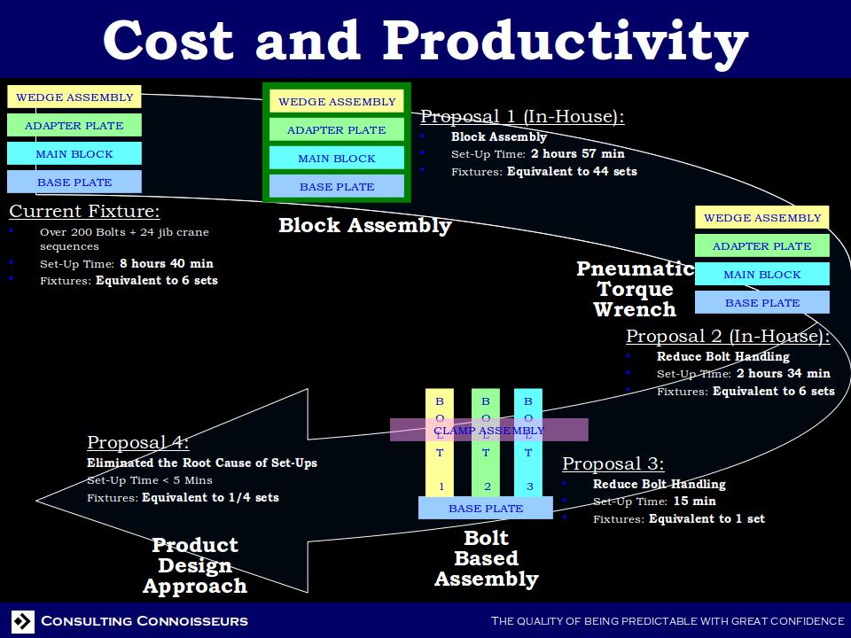 Our mandate was to improve productivity and help reduce operating costs. Phenomenal results from Modelling and Simulation methods based on time-study (Maynard Operations Sequence Technique) and our unique re-engineering approach that showed the lowering of the set-up time at a critical workstation from 8 hours 40 mins to less than 5 mins!